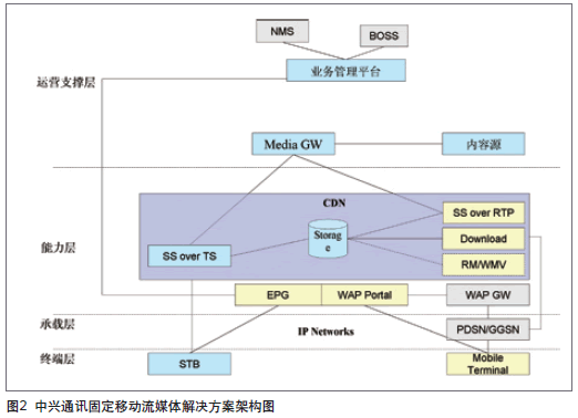 中興通訊的固定移動流媒體解決方案,是在充分比較兩網(wǎng)的異同點之后,構(gòu)架的全新方案,其組網(wǎng)架構(gòu)如圖2所示。