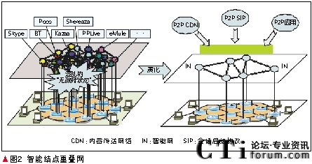 智能節(jié)點(diǎn)重疊網(wǎng)是覆蓋在IP核心網(wǎng)上的傳統(tǒng)的彈性重疊網(wǎng)(RON)技術(shù)與分布式哈希表(DHT)技術(shù)相結(jié)合的新型重疊網(wǎng)技術(shù),包括自動(dòng)組網(wǎng)、網(wǎng)絡(luò)資源管理、路由優(yōu)化等關(guān)鍵技術(shù)。其基本結(jié)構(gòu)是保持TCP/IP協(xié)議不變,原來(lái)的3層變成3-層,在其上建立一個(gè)智能結(jié)點(diǎn)重疊網(wǎng)做為3+層,在此分布式管理平臺(tái)上提供流量監(jiān)控、流量控制、QoS、病毒防止和安全性等服務(wù)。智能結(jié)點(diǎn)重疊網(wǎng)的另外一個(gè)任務(wù)是為各種P2P應(yīng)用提供支撐環(huán)境。它可以為在互聯(lián)網(wǎng)上采用不同協(xié)議和軟件的各種P2P業(yè)務(wù),提供統(tǒng)一的支撐環(huán)境。主要是提供P2P CDN和P2P SIP。智能結(jié)點(diǎn)重疊網(wǎng)如圖2所示。