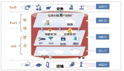 云化的智能管道如圖1所示,包括桌面云->接入云->控制云->感知云->應(yīng)用云,實(shí)際上是端管云一體化的網(wǎng)絡(luò)架構(gòu),建立一個可以自感知、自學(xué)習(xí)、自組織、自適配、自管理的數(shù)字神經(jīng)網(wǎng)絡(luò),提供云化的不同層次業(yè)務(wù)。