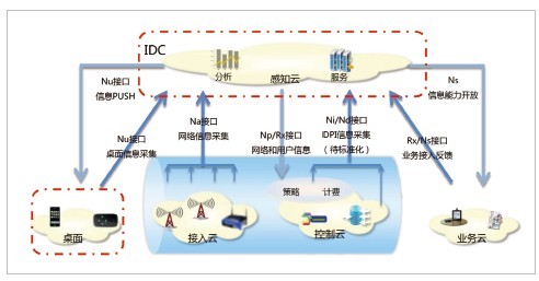 中興通訊增強(qiáng)端到端信息感知和開放接口,提出一套標(biāo)準(zhǔn)架構(gòu)如圖2所示,來實(shí)現(xiàn)整個網(wǎng)絡(luò)透明、可視。建設(shè)網(wǎng)絡(luò)信息采集體系,增強(qiáng)感知云的端到端分析能力;建立“桌面云-感知云”的云端一體化架構(gòu),提供網(wǎng)絡(luò)推送能力;感知云向終端開放網(wǎng)絡(luò)信息和能力,增強(qiáng)用戶感知網(wǎng)絡(luò)、定制個人體驗(yàn)?zāi)芰;感知云向業(yè)務(wù)開放網(wǎng)絡(luò)信息和能力,拓展合作發(fā)展增值業(yè)務(wù)的能力。