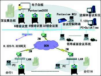 中太數(shù)據(jù)為深圳發(fā)展銀行構(gòu)建的視頻會議項目,是為深圳發(fā)展銀行在已有的DDN網(wǎng)絡(luò)的基礎(chǔ)上,構(gòu)建的一個全國性的會議電視平臺。通過這個平臺,使跨地域的溝通更加經(jīng)濟、高效和靈活。針對深發(fā)展的網(wǎng)絡(luò)實際情況以及會議電視的發(fā)展方向,方案中采用基于MPEG-4的Penteview2030產(chǎn)品,支持H.323的MCU Penteview 6182,以及Penteview數(shù)據(jù)會議服務(wù)器。整個深發(fā)展會議電視系統(tǒng)組網(wǎng)分為兩級,中心點3套Penteview 2030到下面的16個異地的分支行。深圳發(fā)展銀行大廈6樓大會議室、培訓(xùn)小會議室、32樓會議室作為主會議室,在6樓的機房中放置主MCU和一個終端,培訓(xùn)小會議室放置一個終端,其他16個異地分支行分別放置一臺Penteview2030終端,通過現(xiàn)有的深發(fā)展DDN網(wǎng)絡(luò)相互連通。根據(jù)深發(fā)展通信網(wǎng)絡(luò)結(jié)構(gòu)及傳輸容量的實際情況,該系統(tǒng)采用星型拓?fù)溥B接,各地可通過現(xiàn)有的DDN劃出768k-2M的帶寬,以視頻會議的方式組建起多點會議電視系統(tǒng)。各會場通過PC機實現(xiàn)數(shù)據(jù)會議功能。