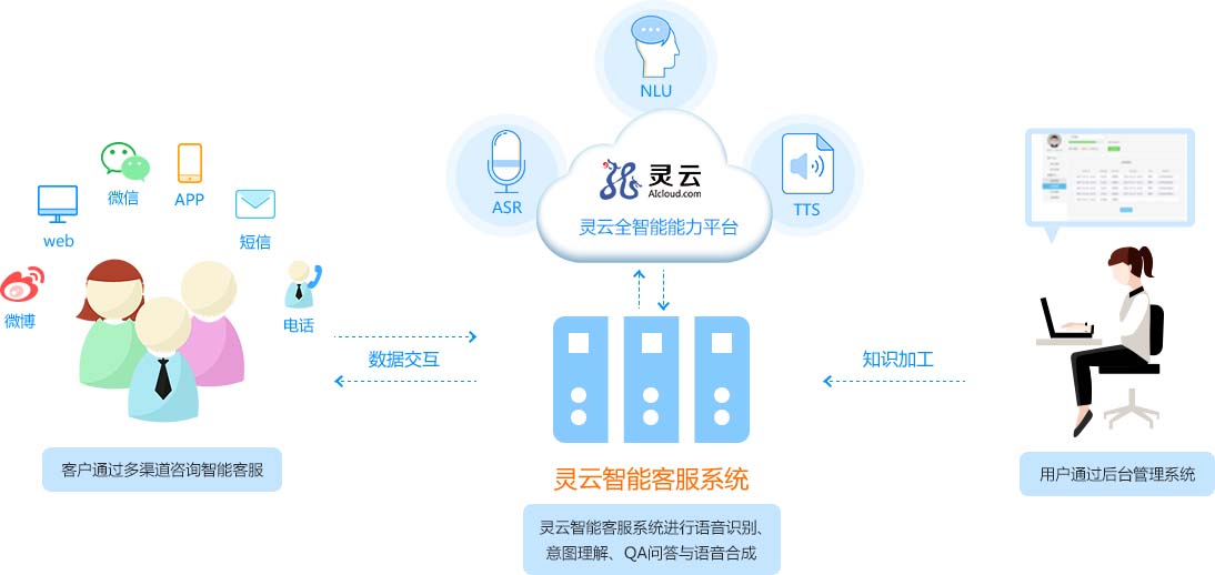 客戶通過電話、微信、網(wǎng)頁等多種渠道咨詢智能客服,靈云全智能客服系統(tǒng)進(jìn)行語音識(shí)別、意圖理解、QA問答與語音合成,企業(yè)通過后臺(tái)管理智能客服系統(tǒng)。