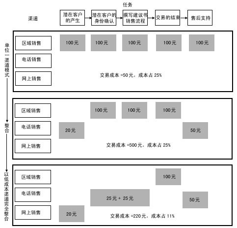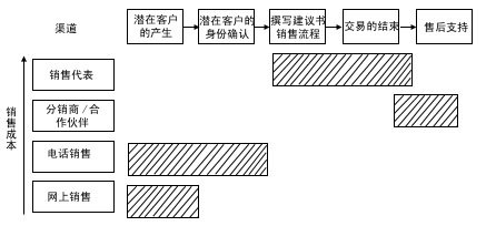 渠道整合強(qiáng)調(diào)在一個(gè)銷售過程中分工的不同給企業(yè)帶來更多的利潤(rùn),將銷售過程的任務(wù)一一分配給不同成本的渠道來完成。銷售過程的中間環(huán)節(jié)——面對(duì)面的銷售和交易的達(dá)成,通常需要由成本較高的區(qū)域銷售代表和分銷伙伴來完成,客戶的產(chǎn)生及身份的確認(rèn)和售后服務(wù)環(huán)節(jié)通常由低成本渠道完成。現(xiàn)在,我們對(duì)照?qǐng)D4來比較一下: