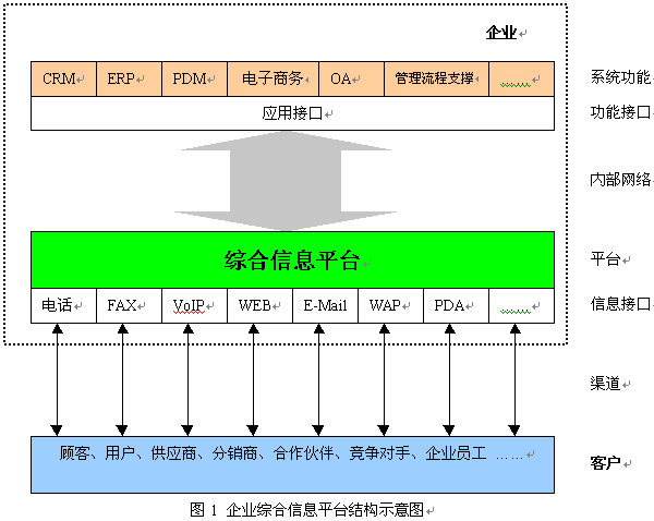 我們今天看待Call Center,也決不僅僅是客戶服務中心這樣一個簡單的傳統(tǒng)概念,它本身所擁有的一些優(yōu)秀的功能和特征,應當擔負起更大的責任,發(fā)揮更大的作用。所以,在當前以客戶為中心的新經(jīng)濟環(huán)境下,企業(yè)信息化的問題是不容回避的,而企業(yè)信息化建設又會牽涉到企業(yè)的方方面面,包括企業(yè)的前臺和企業(yè)的后臺。企業(yè)的前臺是企業(yè)與客戶連接的門戶,它需要與客戶進行良好的溝通,企業(yè)的后臺將為前臺與客戶溝通提供支持,因此,在企業(yè)的前臺和后臺之間,需要一個綜合信息平臺來保證信息流的暢通。