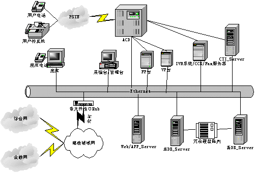 呼叫中心的功能主要有兩方面,一是與用戶進(jìn)行交互,另外與金融主機(jī)房進(jìn)行數(shù)據(jù)交互。呼叫中心系統(tǒng)由兩部分組成:聲訊平臺(tái)(CALL CENTER)和業(yè)務(wù)數(shù)據(jù)計(jì)算機(jī)網(wǎng)絡(luò)平臺(tái)。聲訊平臺(tái)由話務(wù)接入設(shè)備(ACD)、IVR系統(tǒng)和CTI服務(wù)器組成,主要負(fù)責(zé)語(yǔ)音資源的管理、呼入話務(wù)的排隊(duì)、自動(dòng)業(yè)務(wù)以及人工座席的管理等;業(yè)務(wù)數(shù)據(jù)計(jì)算機(jī)網(wǎng)絡(luò)平臺(tái)是對(duì)業(yè)務(wù)數(shù)據(jù)的收集、使用、管理、分析等。平臺(tái)間通過(guò)CTI技術(shù)實(shí)現(xiàn)數(shù)字?jǐn)?shù)據(jù)和語(yǔ)音數(shù)據(jù)的相互轉(zhuǎn)換和同步轉(zhuǎn)移。系統(tǒng)結(jié)構(gòu)如下。