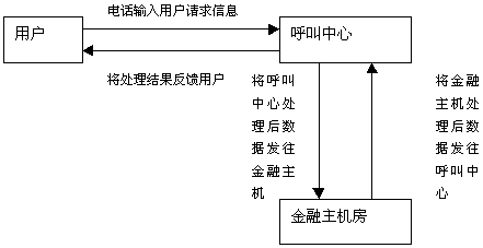 用戶通過(guò)撥打電話185連接到185客戶服務(wù)中 心,然后根據(jù)客戶服務(wù)中心的提示信息利用電話按鍵或語(yǔ)音輸入用戶的請(qǐng)求信息。用戶的請(qǐng)求信息傳送到呼叫中心后,呼叫中心會(huì)根據(jù)用戶的請(qǐng)求信息內(nèi)容進(jìn)行處理,如查詢儲(chǔ)蓄法規(guī)等,然后將處理結(jié)果反饋給用戶,如果牽涉到用戶的帳戶數(shù)據(jù),則呼叫中心將用戶的請(qǐng)求首先進(jìn)行處理,然后將處理后的信息發(fā)送給金融主機(jī)房,由金融主機(jī)根據(jù)呼叫中心傳來(lái)的數(shù)據(jù)進(jìn)行帳務(wù)處理,然后將處理結(jié)果返回給呼叫中心,呼叫中心再對(duì)金融主機(jī)房返回的數(shù)據(jù)進(jìn)行處理成客戶能夠聽(tīng)到的語(yǔ)音信息,將處理結(jié)果傳給用戶。上述流程是一個(gè)單個(gè)處理流程,實(shí)際上跟用戶進(jìn)行交互時(shí),一項(xiàng)業(yè)務(wù)會(huì)有多個(gè)往返的處理流程。