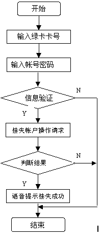 此功能為用戶提供賬號臨時掛失業(yè)務(wù),使用戶的損失減到最小。 用戶通過特定的接入碼進入呼叫中心,選擇賬戶掛失后,呼叫中心語音提示用戶輸入帳號密碼,平臺將用戶的數(shù)據(jù)送至金融主機系統(tǒng),然后根據(jù)返回的信息將處理結(jié)果語音提示給用戶。用戶臨時掛失后,還必須到營業(yè)前臺進行正式的掛失操作。流程圖如下圖。