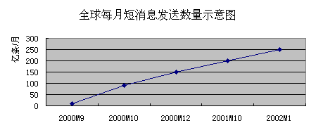 。。2001年全球的短消息服務(wù)業(yè)得到了迅猛的發(fā)展,全球共發(fā)送短消息2000億條。在中國(guó)短消息服務(wù)市場(chǎng)中,中國(guó)移動(dòng)在2001年發(fā)送短消息159億條,中國(guó)聯(lián)通發(fā)送短消息30億條。隨著中國(guó)移動(dòng)和中國(guó)聯(lián)通之間的互聯(lián)互通,中國(guó)短消息市場(chǎng)在2002年將達(dá)到300億條。并且中國(guó)電信和中國(guó)網(wǎng)通也加入到此市場(chǎng)中,中國(guó)固話短消息也將在此市場(chǎng)中占有一席之地。 中國(guó)的移動(dòng)用戶在2002年4月已經(jīng)到了1.6億戶,并且還在以500萬(wàn)戶/月的速度發(fā)展,估計(jì)到2005年中國(guó)的移動(dòng)用戶將達(dá)到4.5億戶,中國(guó)手機(jī)用戶在35歲以下的占80%左右,他們是使用短消息的主體人群,因此中國(guó)移動(dòng)短消息具有非常大的發(fā)展?jié)摿Α?/p>