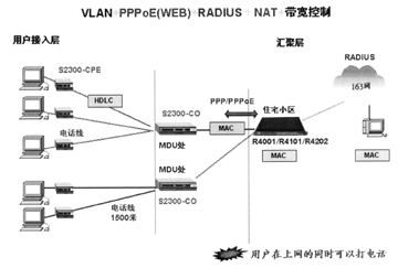 圖2所示的是VDSL技術(shù)與以太網(wǎng)技術(shù)聯(lián)合打造的新型接入方案。武漢烽火網(wǎng)絡(luò)公司生產(chǎn)的S2300系列VDSL交換機使用戶在現(xiàn)有電話線路上獨立享用固定的獨立的帶寬,安全地進(jìn)行數(shù)據(jù)連接,同時以太網(wǎng)的PPPoE認(rèn)證、NAT地址變換等功能又將用戶帶入迷幻的網(wǎng)絡(luò)世界。