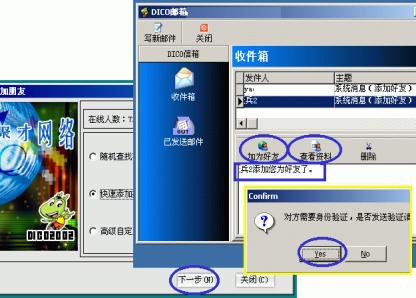 3、點按主窗口下方的"覓友"按鈕,彈出的對話框中選擇三種添加方式之一后按"下一步"進(jìn)行好友的添加;當(dāng)有人加你為好友時,系統(tǒng)會有提示音閃并DICO圖標(biāo)在任務(wù)欄不斷閃爍,你點擊上來后會彈出你的DICO郵箱對話框并收到有某某加你為好友的消息,此時可先點按"查看資料"了解一下來人相關(guān)信息;若有意可點按"加產(chǎn)好友"加來訪者為好友(下圖7)。