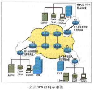 下圖是提供VPN業(yè)務(wù)的例子。其中業(yè)務(wù)提供者邊界路由器(PE)相當(dāng)于MPLS區(qū)域邊界路由器(LER),它了解整個MPLS VPN的網(wǎng)絡(luò)拓?fù)浣Y(jié)構(gòu)。用戶邊界路由器(CE)可以只是一個