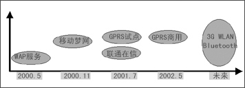 2000年5月,中國移動(dòng)推出了WAP服務(wù),但是由于準(zhǔn)備不足,加之中國移動(dòng)沒有完全轉(zhuǎn)變經(jīng)營理念,使得WAP服務(wù)沒有達(dá)到預(yù)期的發(fā)展目標(biāo)。在吸取WAP服務(wù)的經(jīng)驗(yàn)、教訓(xùn)后,中國移動(dòng)于2000年11月又推出了“移動(dòng)夢網(wǎng)”計(jì)劃。在這次的業(yè)務(wù)推廣中,短消息受到了人們的寵愛,發(fā)展到現(xiàn)在,SMS已經(jīng)深入多數(shù)移動(dòng)用戶的心中。2001年7月,中國聯(lián)通也推出了“聯(lián)通在信”與“移動(dòng)夢網(wǎng)”進(jìn)行競爭(如圖1所示)。與此同時(shí),中國移動(dòng)又開始了GPRS的試點(diǎn)工作,經(jīng)過近一年時(shí)間,“聯(lián)通在信”并沒有取得更好的成績,而中國移動(dòng)的GPRS終于開始正式商用。那么,未來的移動(dòng)數(shù)據(jù)業(yè)務(wù)將依托什么來發(fā)展呢?是3G,還是WLAN、藍(lán)牙?大家只能拭目以待。