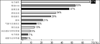 到底有多少人需要移動(dòng)數(shù)據(jù)業(yè)務(wù)呢?有資料顯示,當(dāng)前有36%的人對移動(dòng)數(shù)據(jù)業(yè)務(wù)處于觀望狀態(tài),只要移動(dòng)數(shù)據(jù)業(yè)務(wù)發(fā)展得好,他們肯定會(huì)加入進(jìn)來。我們相信,現(xiàn)在已經(jīng)有一定比例的人開始從觀望狀態(tài)加入使用移動(dòng)數(shù)據(jù)業(yè)務(wù)的行列中來。如圖2所示,在用戶需求中,電子郵件占67%,娛樂性的業(yè)務(wù)也占有較高的比例,新聞、信息類其次。這些數(shù)據(jù)說明,人們使用移動(dòng)數(shù)據(jù)業(yè)務(wù),大部分的習(xí)慣是沿襲互聯(lián)網(wǎng)的,這也為移動(dòng)網(wǎng)絡(luò)與互聯(lián)網(wǎng)的結(jié)合奠定了用戶基礎(chǔ)。