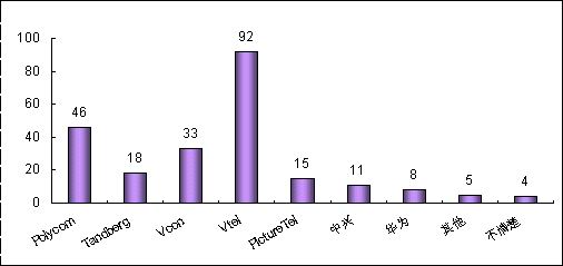 各品牌的認(rèn)知度與其市場(chǎng)銷售情況息息相關(guān)。例如,VTEL是最早進(jìn)入中國市場(chǎng)的視頻會(huì)議廠商,并在相當(dāng)長的時(shí)期內(nèi)占據(jù)市場(chǎng)領(lǐng)先地位,取得顯著的品牌認(rèn)知度是有其廣泛用戶基礎(chǔ)作為支撐的;POLYCOM雖然從1998年才開始進(jìn)軍中國市場(chǎng),但在基于IP的視頻會(huì)議系統(tǒng)的市場(chǎng)爭(zhēng)奪中取得較好的成績;PictureTel已經(jīng)被POLYCOM收購,品牌認(rèn)知度也相對(duì)較低;而國內(nèi)品牌中興、華為剛剛起步,也很難達(dá)到較高的認(rèn)知度。