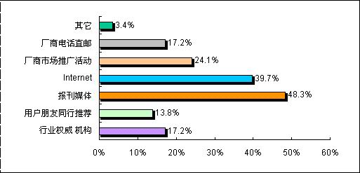 此次調(diào)查顯示,由于視頻會(huì)議系統(tǒng)的行業(yè)性相對(duì)較強(qiáng),目前用戶在了解視頻終端會(huì)議系統(tǒng)產(chǎn)品時(shí),報(bào)刊媒體、Internet、廠商推廣活動(dòng)、廠商電話直郵和行業(yè)權(quán)威機(jī)構(gòu)成為主要的信息來源渠道。值得注意的是網(wǎng)絡(luò)的普及使得更多的用戶也選擇Internet作為了解信息的重要途徑。但對(duì)各視頻會(huì)議系統(tǒng)的廠商而言,由于客戶群體相對(duì)龐大,分散區(qū)域較為廣泛,在作好直銷的同時(shí),也應(yīng)該加強(qiáng)渠道的建設(shè),以更及時(shí)和準(zhǔn)確地了解到用戶采購和招標(biāo)的信息,同時(shí)也能夠降低銷售成本。
