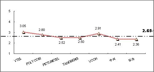 為深入了解和對(duì)比被調(diào)查者對(duì)不同品牌視頻會(huì)議終端系統(tǒng)產(chǎn)品的認(rèn)知程度,本次調(diào)查將被調(diào)查者對(duì)各主要品牌的了解程度劃分為五個(gè)檔次,對(duì)不同的檔次賦予不同的分值,分別為“非常了解(5分)”、“了解(4分)”、“一般(3分)”、“不了解(2分)”、 “非常不了解(0分)”,同時(shí)綜合考慮以購買用戶擁有的品牌分布,借以比較不同品牌在認(rèn)知度上的差異。統(tǒng)計(jì)結(jié)果顯示,目前在中國市場(chǎng)上,用戶對(duì)主要視頻會(huì)議終端系統(tǒng)產(chǎn)品品牌的了解程度的平均值為2.65,各品牌認(rèn)知度分值見圖6。其中:VTEL品牌的知名度最高,指標(biāo)值為3.05,超過了“一般”了解水平;其次為VCON品牌,指標(biāo)值為2.91;POLYCOM的知名度指標(biāo)值為2.8,處于第三位。除VTEL品牌外,其他主要品牌的知名度還都處于低于“一般”了解水平階段,反映出產(chǎn)品的市場(chǎng)認(rèn)知還較低。