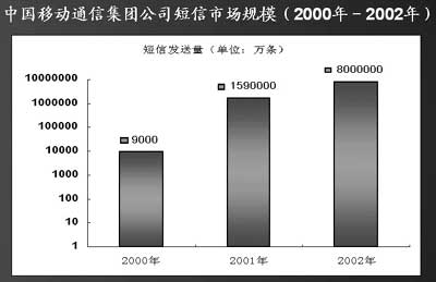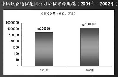 “從2001年的189億條增長到2002年的超過900億條,我國短信業(yè)務(wù)的增長率是移動用戶數(shù)增長率的3.4倍。” 計世資訊分析師許牧說。