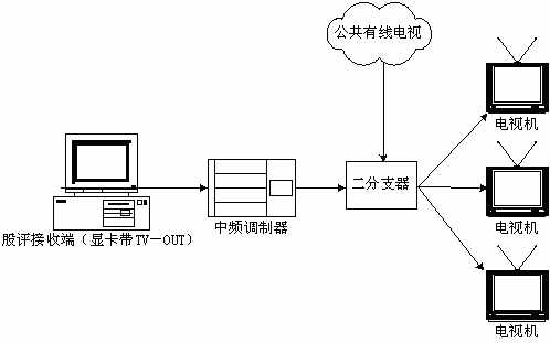 本系統(tǒng)接收端接收實(shí)時(shí)廣播時(shí),除了用普通PC機(jī)收看,或把PC機(jī)接收到的信號(hào)輸?shù)诫娨暎ù笃粒┥鲜湛,甚至還可以接入有線電視網(wǎng)進(jìn)行播放。具體方法是通過(guò)一個(gè)接收端接收股評(píng)節(jié)目,通過(guò)帶TV-OUT的顯卡把TV信號(hào)輸出到中頻調(diào)制設(shè)備,中頻調(diào)制設(shè)備可以把基帶模擬信號(hào)轉(zhuǎn)換成一個(gè)有線電視信號(hào),且傳輸距離遠(yuǎn),損失小,再把這個(gè)信號(hào)與有線電視信號(hào)一起接入一個(gè)二分支器(2進(jìn)1出),這就可以和公共有線電視共存,形成自己的頻道,供電視接收。