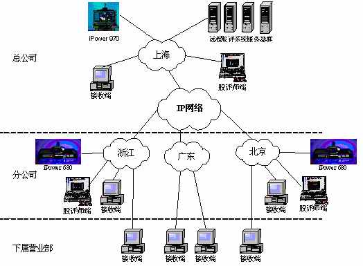 某證券公司有三級(jí)網(wǎng)絡(luò),總公司、分公司和下屬營(yíng)業(yè)部。總公司到分公司帶寬是2M,在總公司配置一套會(huì)議室型電視會(huì)議終端POLYCOM 970和一套多點(diǎn)會(huì)議服務(wù)器Radvision ViaIP400。在分公司配置了38套會(huì)議室型電視會(huì)議終端POLYCOM 680,用于與總公司進(jìn)行雙向視頻會(huì)議。分公司到營(yíng)業(yè)部帶寬是512K,各營(yíng)業(yè)部安裝遠(yuǎn)程股評(píng)系統(tǒng)接收端程序,遠(yuǎn)程股評(píng)系統(tǒng)服務(wù)器都放置在海通總公司。當(dāng)在總公司進(jìn)行股評(píng)時(shí),總公司本地?cái)z像頭拍攝教師畫(huà)面,MIC采集教師聲音,傳給服務(wù)器編碼,再通過(guò)網(wǎng)絡(luò)供各個(gè)接收端接收;當(dāng)在分公司進(jìn)行股評(píng)時(shí),首先分公司的電視會(huì)議設(shè)備采集教師畫(huà)面及聲音傳回總公司的電視會(huì)議設(shè)備,再傳給遠(yuǎn)程股評(píng)系統(tǒng)的服務(wù)器進(jìn)行編碼,然后通過(guò)網(wǎng)絡(luò)發(fā)布,供接收端接收。(結(jié)構(gòu)如下圖)