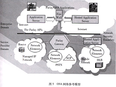 為了克服傳統(tǒng)智能網(wǎng)的上述不足,開放業(yè)務(wù)體系結(jié)構(gòu)(OSA,Open Service Architecture)應(yīng)運(yùn)而生。如圖5所示,OSA是一種全新的業(yè)務(wù)體系結(jié)構(gòu),主要包括底層通信網(wǎng)絡(luò),高層的應(yīng)用服務(wù)器(Application