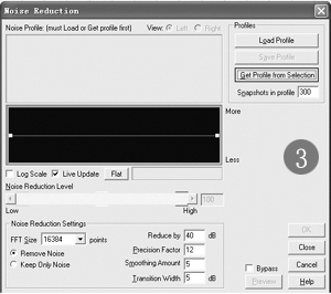 from Selection按鈕,程序會(huì)讀入噪音樣本,之后關(guān)閉該對話框回到主界面,單擊噪音樣本音軌,按Delete刪除它,再雙擊另外一個(gè)波音音軌,進(jìn)入波音編輯器界面再雙擊,全選之后按照上面的操作再次打開Noise