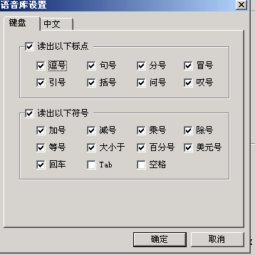 如果需要進一步的調整,可以選擇菜單里的“設置……”。打開設置窗口(如圖3)。窗口共分四個選項,每個選項里除了剛介紹的幾種常用功能調整外,還可以控制歡迎畫面、開始畫面、設定存儲等功能,規(guī)定提示速度、朗讀速度的快慢,選擇提示方式,設定提示報警條件。在“語音庫”選項中還可以選擇朗讀為男聲還是女聲。單擊“設置”按鈕,可以根據(jù)具體需要選擇“鍵盤”或“中文”里被朗讀標點符號的種類(如圖4)。