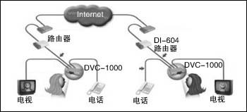 Modem上。圖1通過DI-604路由器與DSL Modem連接,實(shí)現(xiàn)與Internet互聯(lián)。DVC-1000還配備了一個電話機(jī)接口,可以外接一部普通電話機(jī)作為話音交流和撥號設(shè)備。