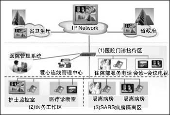 在安裝過程中,醫(yī)院通過原有的網(wǎng)絡(luò)系統(tǒng)就可完成視頻系統(tǒng)的搭建,該系統(tǒng)可應(yīng)用于隔離區(qū)、護(hù)士監(jiān)控室、會議室、醫(yī)療診斷室、住院部等地方。每個房間只要安裝一臺DVC-1000,同時配備電視機(jī)或投影機(jī)等視音頻播放設(shè)備,通過上面所述的安裝程序,就可以搭建一套互動式的視頻系統(tǒng),這樣醫(yī)護(hù)人員只要在監(jiān)控室就可以隨時觀察隔離區(qū)的病人(如圖2所示)。