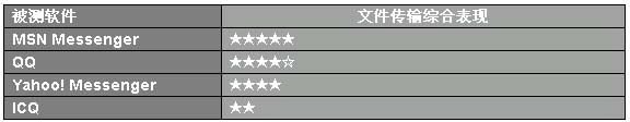 評測傳輸結(jié)果表明,MSN Messenger 6.0穿防火墻的能力很強(qiáng),而且傳輸速度還不錯;QQ的速度與MSN Messenger相當(dāng),但防火墻穿越能力和傳輸穩(wěn)定性上略遜一籌;Yahoo! Messenger對50M的文件好像有點(diǎn)消化不良;ICQ的傳輸成功率幾乎為20%,成功后效果也不盡如人意。