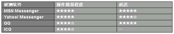 MSN Messenger和Yahoo! Messenger的操作都很簡單,只是MSN Messenger在同樣的畫質(zhì)下延遲要小于Yahoo! Messenger,表現(xiàn)出更優(yōu)的實(shí)用性。QQ操作也不算太復(fù)雜,只是會員和非會員在功能上有一些限制,不過在同畫質(zhì)的延遲方面做的算是出色,ICQ操作沒有測試成功。