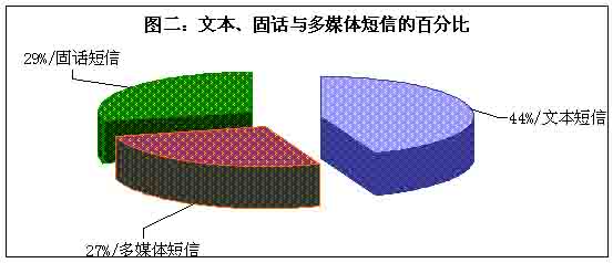 目前市場(chǎng)的主流短信主要有三大類,即傳統(tǒng)的手機(jī)文本短信、流行的圖音文字兼?zhèn)涞摹安市拧焙托峦瞥龅墓淘挾绦拧U麄(gè)短信市場(chǎng)確實(shí)火了,但是在火爆的背后哪一種短信是真正的巨無(wú)霸?調(diào)查表明,在三類短信之中,選擇文本類短信的用戶最多,占據(jù)44%,其次是固話短信,再次是多媒體短信,即俗稱的“彩信”,選擇固話短信和彩信的百分比十分接近。(見(jiàn)圖二)看來(lái),“巨無(wú)霸”非文本類短信莫屬。