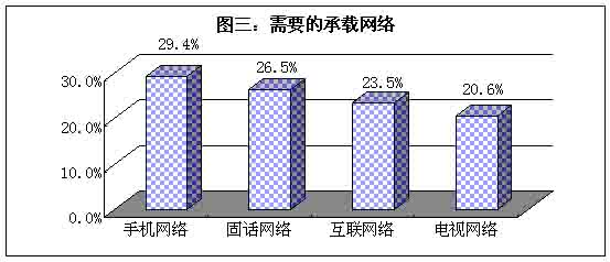 首先,手機(jī)構(gòu)成移動(dòng)的網(wǎng)絡(luò)已經(jīng)超過(guò)傳統(tǒng)的龐大的固話網(wǎng)絡(luò),成為用戶目前用戶最需要的承載網(wǎng)絡(luò)。這顯然是用戶市場(chǎng)對(duì)移動(dòng)通訊方式的需求日漸強(qiáng)烈的表現(xiàn)。其次,電視網(wǎng)絡(luò)拉后于固話和互聯(lián)網(wǎng)絡(luò),排在最后一位,這反映了未來(lái)網(wǎng)絡(luò)向雙向溝通發(fā)展的態(tài)勢(shì)。最后,互聯(lián)網(wǎng)絡(luò)雖然早于移動(dòng)網(wǎng)絡(luò)的發(fā)展,而用戶卻更為看重后者,原因是作為互聯(lián)網(wǎng)絡(luò)終端設(shè)備的電腦,還不能走入普通百姓家庭,因此終端設(shè)備成為互聯(lián)網(wǎng)絡(luò)發(fā)展的門(mén)檻。