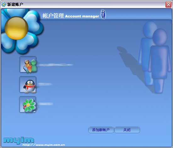 先添加相應(yīng)的賬戶;點(diǎn)擊"添加新賬戶"按鈕,彈出"賬戶管理"頁面,在"服務(wù)類型"的下拉列表中選擇相應(yīng)的服務(wù)類型,再依次輸入用戶名和密碼;設(shè)定完成后點(diǎn)擊"保存"即完成新賬戶的添加;保存完畢后myim自動(dòng)返回登錄界面。