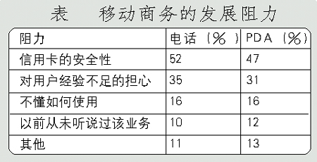 手機(jī)支付業(yè)務(wù)的進(jìn)一步發(fā)展主要受制于用戶對該項(xiàng)業(yè)務(wù)的接受程度。Forrester研究公司的研究表明,超過一半的被訪者認(rèn)為信用卡的安全性是移動商務(wù)發(fā)展的主要阻力。(調(diào)查結(jié)果見下表)