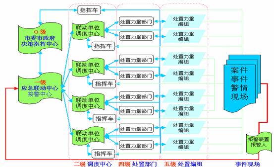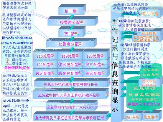 根據(jù)接過來的警情,應(yīng)急聯(lián)動(dòng)系統(tǒng)向處置力量部門發(fā)出指令派出處置力量編組到現(xiàn)場(chǎng),并根據(jù)現(xiàn)場(chǎng)反饋回來的信息,決定是否增援或歸隊(duì)。事件記錄通過局域網(wǎng)被送到相應(yīng)的處警員終端,處警員通過計(jì)算機(jī)輔助調(diào)度系統(tǒng)查詢相關(guān)資料,制定反應(yīng)措施,并向相關(guān)聯(lián)動(dòng)單位發(fā)出具體調(diào)度指令。在緊急事件發(fā)生時(shí),相應(yīng)的電子預(yù)案會(huì)被觸發(fā)啟動(dòng)。如果發(fā)生了重大災(zāi)難,險(xiǎn)情或特殊的事件,則可以啟用城市緊急狀態(tài)指揮室,由首長進(jìn)行統(tǒng)一指揮。