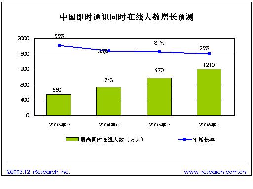 我們預(yù)計(jì)未來隨著中國上網(wǎng)人口的增長,以及IM軟件的不斷普及,即時(shí)通訊在線人數(shù)將保持快速增長。預(yù)計(jì)2004年國內(nèi)IM最高同時(shí)在線人數(shù)有望突破740萬人,到2006年將突破1200萬人同時(shí)在線。