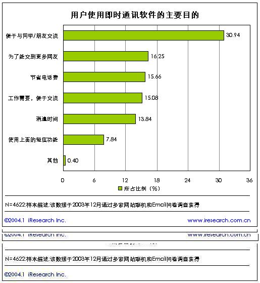 即時(shí)通訊作為網(wǎng)民最常使用的應(yīng)用之一,即時(shí)通訊的多功能性可以滿足用戶的不同需求,達(dá)到不同的目的,根據(jù)艾瑞市場(chǎng)咨詢(iResearch)的研究結(jié)果,在問及用戶使用即時(shí)通訊的目的時(shí),有31%的用戶選擇了“便于與同學(xué)/朋友交流”作為使用即時(shí)通訊軟件的最主要的目的,16%的用戶選擇“為了交到更多的朋友”作為作主要的目的,兩者相加的比例接近了50%。說明與朋友、網(wǎng)友間的交流聊天仍然是即時(shí)通訊軟件的最主要的功能。同時(shí),即時(shí)通訊軟件用戶一般還同時(shí)使用包括文件傳送、語音聊天、郵件檢查、群組聊天、手機(jī)綁定等其他功能。而文件傳輸是其中最主要的一項(xiàng)功能。