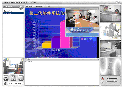 計(jì)算機(jī)、網(wǎng)絡(luò)技術(shù)高速發(fā)展的今天,傳統(tǒng)的通訊方式日益滿足不了人們的要求。人們要求能進(jìn)行遠(yuǎn)程會(huì)議,開展面對(duì)面的交流;同時(shí),在滿足傳統(tǒng)視頻會(huì)議音/視頻通信的基本要求之外,現(xiàn)代會(huì)議更希望能夠提供更加豐富多樣的會(huì)議討論形式和功能,比如:遠(yuǎn)程開展季度/年度預(yù)算及工作計(jì)劃的討論,需要遠(yuǎn)程共享PPT等演示文檔和EXCEL等表格,需要共同就某一網(wǎng)上信息開展討論,甚至能夠?qū)㈤_會(huì)的通知通過電子郵件和手機(jī)短消息的方式傳達(dá)到每一個(gè)與會(huì)者那里。