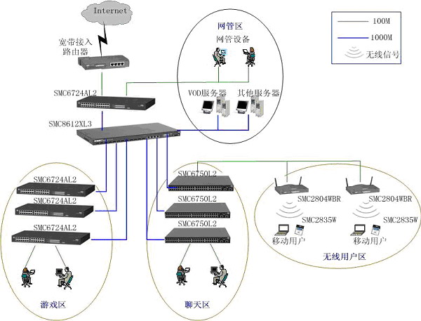 本方案采用"千兆光纖干線,百兆交換到桌面"的設計思路,各骨干線路均為1000M。骨干網(wǎng)通過高速線路接入INTERNET,網(wǎng)吧內實現(xiàn)主干千兆交換、百兆到點,整個網(wǎng)吧內實現(xiàn)無阻塞通信。根據(jù)顧客的不同消費需求,將網(wǎng)吧分為了網(wǎng)絡游戲區(qū)、聊天區(qū)、貴賓區(qū)等,根據(jù)不同區(qū)域的特點,細化了不同網(wǎng)絡的解決方案。方案中采用的核心設備和二層設備都支持802.1Q標準VLAN和IGMP組播協(xié)議,為VOD、多媒體娛樂等豐富應用的開展打下了堅實的基礎 。通過劃分VLAN,MAC地址綁定來劃分了不同類型用戶,很好地滿足網(wǎng)吧的各項業(yè)務應用需求。此外,SMC的豐富無線網(wǎng)絡產品可以很靈活的滿足網(wǎng)吧的組網(wǎng)需求,投資少、施工快。在提供高性能的同時,還保證很好的安全性,既支持基于802.11b標準的安全機制,又支持動態(tài)安全鏈路,以及基于802.1x的增強性安全或認證功能。