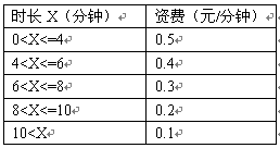 例3,國內(nèi)長途話費在時長不超過4分鐘的情況下,按0.07元/6秒收;超過4分鐘但不超過6分鐘,統(tǒng)一按0.06元/6秒收。怀^6分鐘但不超過8分鐘,統(tǒng)一按0.05元/6秒收。怀^8分鐘但不超過10分鐘,統(tǒng)一按0.04元/6秒收取;超過10分鐘,統(tǒng)一按0.03元/6秒收取。