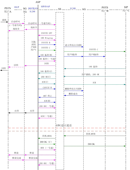 圖4為PSTN用戶A撥打一號通用戶,同振到軟交換域AG下POTS用戶B和SIP用戶C,其中軟交換和應(yīng)用服務(wù)器以SIP協(xié)議相連,軟交換和AG、軟交換和TG以H.248協(xié)議相連?梢钥吹,用戶B和用戶C同時振鈴,用戶C摘機應(yīng)答,應(yīng)用服務(wù)器取消了對用戶B的振鈴。雙方通話,通話結(jié)束,用戶C掛機,系統(tǒng)釋放了連接。