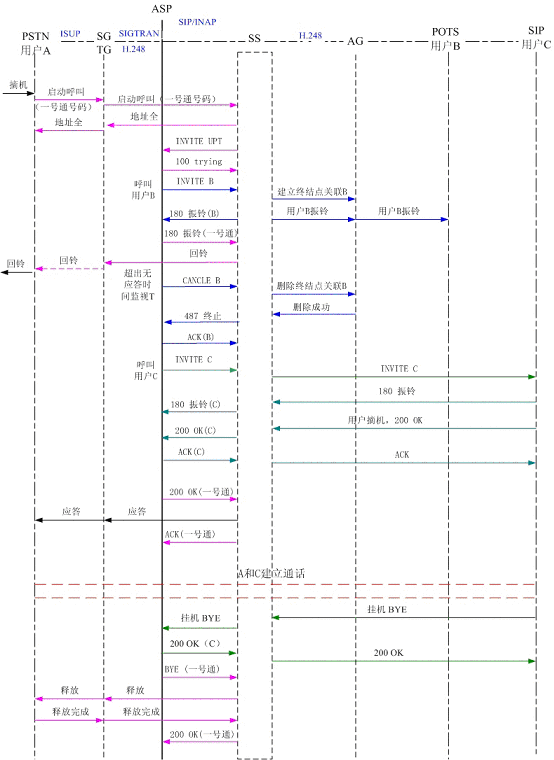 圖5為PSTN用戶A撥打一號通用戶,順呼軟交換域AG下POTS用戶B和SIP用戶C,其中軟交換和應(yīng)用服務(wù)器以SIP協(xié)議相連,軟交換和AG、軟交換和TG以H.248協(xié)議相連?梢钥吹剑脩鬊首先振鈴,振鈴達到規(guī)定時間后,應(yīng)用服務(wù)器取消了對用戶B的振鈴,轉(zhuǎn)而對用戶C振鈴。用戶C摘機應(yīng)答,通話結(jié)束,用戶C掛機,系統(tǒng)釋放了呼叫。