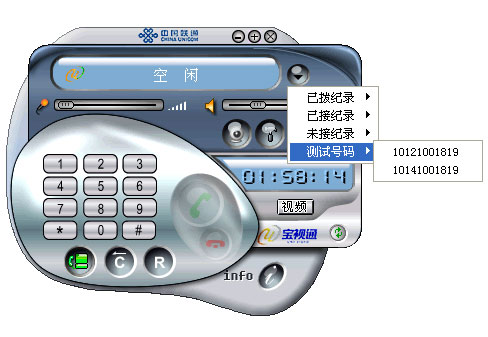 通話記錄很詳細(xì),除了“已撥”、“已接”、“未接”外,還有一項(xiàng)“測試號碼”,可以讓用戶撥打聯(lián)通“寶視通”的服務(wù)熱線測試可視電話是否正常工作,也可以向服務(wù)人員詢問相關(guān)的服務(wù)內(nèi)容。
