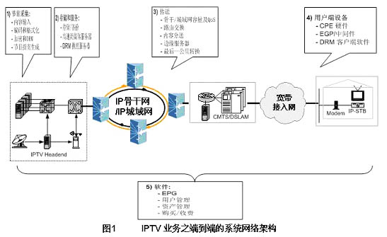 IPTV系統(tǒng)技術(shù)能用來(lái)提供將視音頻流媒體節(jié)目,如IP電視節(jié)目,從節(jié)目中心(first mile)播出,并通過骨干網(wǎng)、城域網(wǎng)和寬帶接入網(wǎng)(last mile)傳輸,直到被用戶接收之端到端的完整技術(shù)解決方案。一個(gè)端到端的IPTV系統(tǒng)一般具有節(jié)目采集、存儲(chǔ)和服務(wù)、節(jié)目傳送、用戶終端設(shè)備和相關(guān)軟件等五個(gè)功能部件。