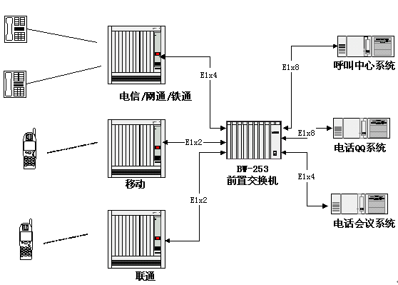 - 能與多個運營商的交換機連接,將呼叫分配到后端的多種語音業(yè)務(wù)系統(tǒng)。