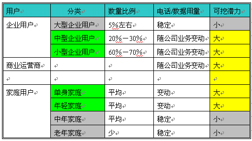 從以上表格可以清楚的顯示中小企業(yè)、商業(yè)運(yùn)營(yíng)商、年青用戶對(duì)電話和數(shù)據(jù)的使用不穩(wěn)定,這就意味者可發(fā)展、擴(kuò)大使用的可能性非常大,是企業(yè)增加收入的潛在用戶,但最主要的是如何提高這些用戶的使用呢?經(jīng)濟(jì)規(guī)律告訴我們?nèi)绻闾峁┑纳唐穼?duì)用戶有用,同時(shí)價(jià)廉、物美,用戶是不會(huì)拒絕的。對(duì)于電話運(yùn)營(yíng)商來講就是提供給企業(yè)帶來方便、效率、節(jié)省成本、方便管理的服務(wù)的同時(shí),提高有效接通率。