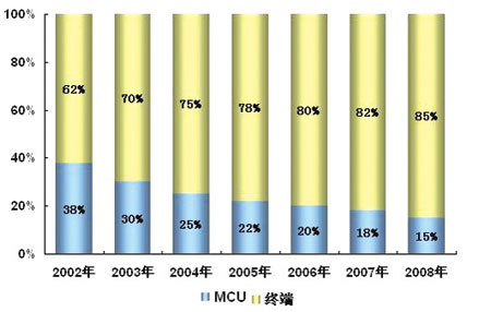 一般來說,終端和MCU是視頻會(huì)議系統(tǒng)產(chǎn)品最為關(guān)鍵的部分。計(jì)世資訊(CCW Research)的研究表明:近年來,終端的銷售比例持續(xù)增長(zhǎng),而MCU的銷售比例則相應(yīng)萎縮。2005年,終端和MCU的比例分別為78.0%和22.0%。