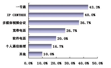 CENTREX感興趣的用戶為40.0%,對多媒體視頻會議感興趣的用戶達(dá)到36.7%,對寬帶電話感興趣的用戶達(dá)到26.7%。