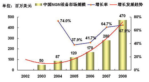 2005年全球?qū)τ贜GN的基礎(chǔ)實施的建設(shè)將會進(jìn)入快速啟動期,而2005年以后中國的NGN的市場將進(jìn)入黃金發(fā)展時期。
