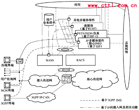 在標(biāo)準(zhǔn)方面,基于SIP的3GPP IMS是目前比較完善的體系結(jié)構(gòu),ETSI、ITU-T等已經(jīng)有在固定領(lǐng)域應(yīng)用IMS架構(gòu)的明確傾向,以后的固定NGN的多媒體域網(wǎng)絡(luò)架構(gòu)將可能基于3GPP IMS發(fā)展。同時,ITU-T、ETSI所定義的NGN業(yè)務(wù)需求包括了通信、信息、娛樂等業(yè)務(wù),移動性已經(jīng)成為固定NGN的一個重要需求,NGN將在IMS架構(gòu)基礎(chǔ)上擴(kuò)展支持固定接入和其他融合業(yè)務(wù)。